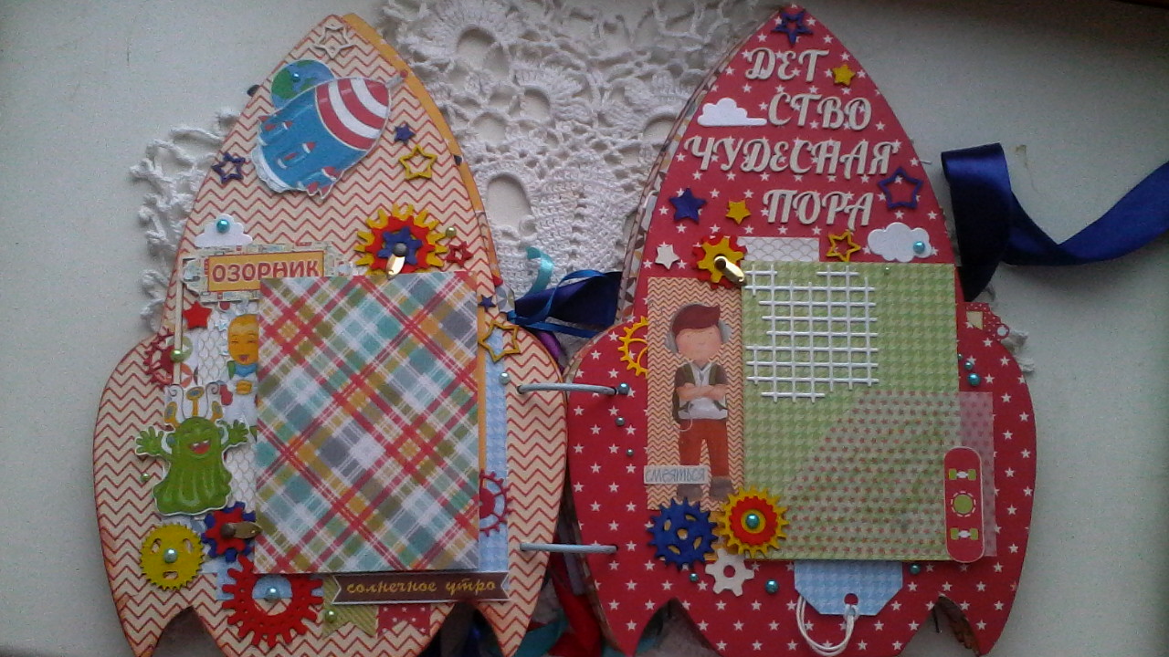 Я записалась на курс ради только одного альбома - Замка для принцессы. Я спать не могла грезила им и решилась. А когда получила доступ к курсу то меня понесло. Альбом сумочка есть (покажу позже), теперь ракета. Моя Ракета, Такая клева, сижу и рассматриваю ее как будь то не сама ее творила. Бумагу я взяла попроще ( пока напряг с денежками - сижу в декретном отпуске с дочкой). СкрапМир меня устроил по всем показателям: Яркая ( сам то для мальчишки), плотная, есть вырезалки, когда покупала у нее еще не было высечек (вот это очень огорчило)их то мне очень не хватало. Вся ракета сделана полностью из бумаги СкрапМир " Такие мальчишки" . дополнительных листов не покупала, использовала только то что есть в наборе, наврала распечатывала инопланетян и ракеты)))) Вот что получилось у меня. А вот и сама ракета: